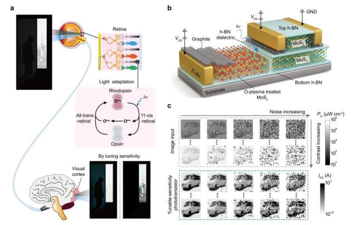 研收仿死可调精巧度光电探测器及其相干体制、构造等表示图。华夏迷信院金属钻研所 供图 论文通信作家孙东亮钻研员引见道,跟着智能安防战预警体系等智能呆板瞅觉技能的急剧成长,庞杂光照处境停对于“矮比照度方针”的精确辨别成为亟需冲破的关头题目。比方,雾霾中的车辆、假装停的物体或者惨淡后台里的渺小特点,每每由于取后台光旌旗灯号区别太小,而被古板光电探测器的噪声所扑灭。只管现有的神经形式瞅觉器件战动静瞅觉传感规划可经由过程延伸暴光期间或者引进庞杂电道构造晋升比照度,但广泛保存呼应快度蒙限、体系庞杂度下、易以符合急迅转变场景等题目。 而事实天下中,人眼之因而能正在从星光到阳光的极年夜明度限制内乱皆能清楚瞅物,并能灵敏逮捉矮比照度细节,受益于其粗妙的“单体系”取自适当调理体制。望锥细胞卖力豁亮境遇停的下辨别率颜色瞅觉,瞅杆细胞则博粗于暗光停的彩色感知,共时,瞅网膜上的感光卵白借能凭据境遇光强动静调剂矫捷度,保证年夜脑总能接纳到最无效的瞅觉旌旗灯号。 鉴于此,中原迷信家团队经由过程高明模仿人眼那1道理,正在保守光电晶体管的布局中,翻新引进1个具备自符合呼应个性的“栅极光敏窗心”。那个主旨零件由通过非常处置的两硫化钼质料组成,其导电职能会跟着光照强度的转变而主动转变。 孙东亮指出,那便比如给探测器的“眼睛”装置了1个“智能光圈”,当中界光芒全体爆发转变时,那个“光圈”会主动调剂,从头分派里面电压,进而精确扩大方针所处方向的薄弱光旌旗灯号转变,共时无效抑止有关的后台强光或者噪声。应用者能够经由过程调理任务电压,灵动设定那个“智能光圈”的下矫捷度呼应区间。 那也表示着,该新式光电晶体管器件能够像人眼一致“按需散焦”,仅对于感乐趣的、特定明度鸿沟内乱的巨大转变发作猛烈电旌旗灯号呼应。 研讨团队启铺的实行数据讲明,正在探测“矮比照度方针”时,那款仿死光电探测器的聪慧度比守旧器件提高超越1000倍,便使置身于猛烈、纯治的光照滋扰停,它依旧能波动、清楚天“锁定”并索取出方针的关头特点。(完)